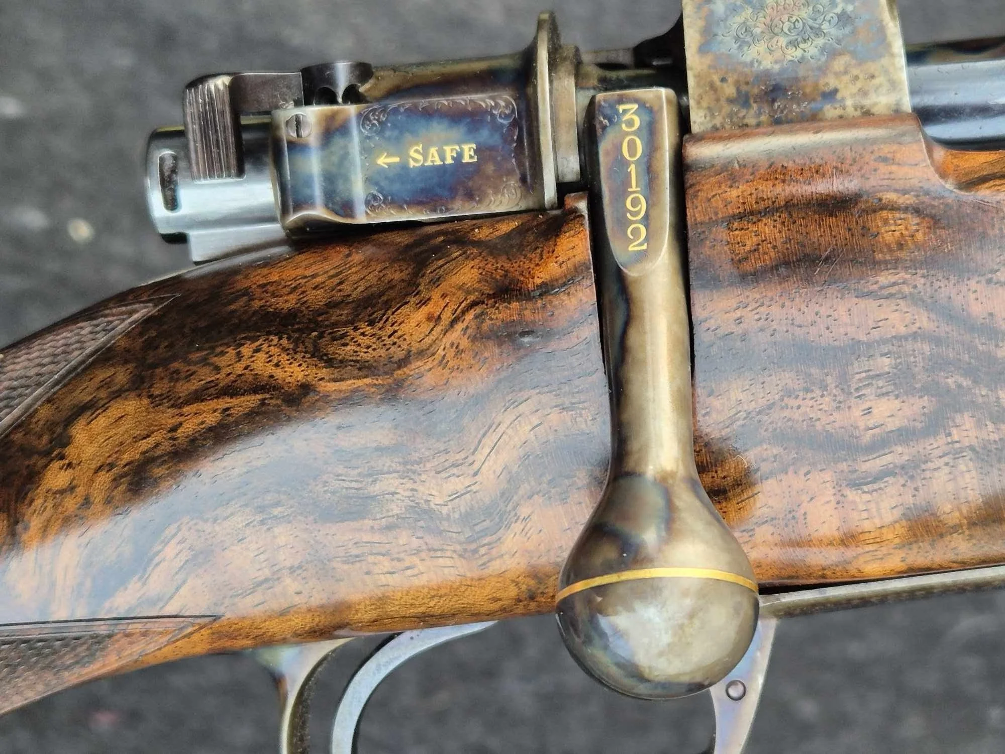 Fullgravert og flammeherdet låskasse og kikkertmontasje i Purdeys "rose and scroll" med noe gullinnlegg. Exhibition grade valnøtttre. Ibenholt skjefteavslutning. Lærtrukket kolbekappe. Zeiss Victory kikkert 1,5-6 x 42 med rødpunkt. Bygget på nyprodusert Mauser M98-låskasse. Dette geværet holder en håndverkskvalitet og overflatekvalitet som er uovertruffen. Et gevær med usedvanlig sjel. Nypris 2024 er 70 000 pund. Tilstand som ny.