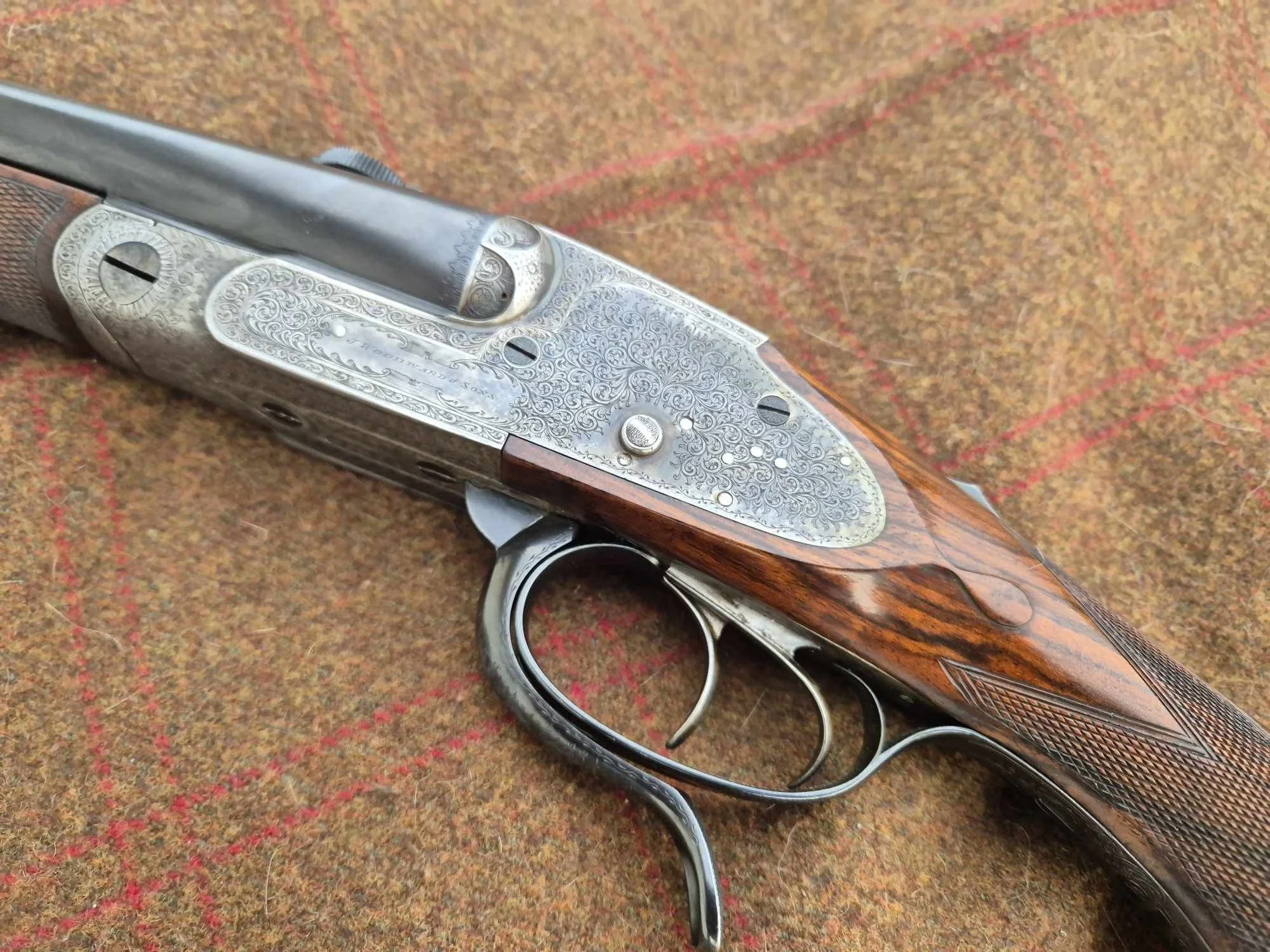 Britisk børsemakerkunst på aller høyeste nivå. Woodwards "The Automatic"-mekanisme er høyt ansett, og dette er faktisk den aller siste Woodward-rifla av sitt slag som ble bygget. Første eier var the Earl of Cork. Nye løp på 1950-tallet. Helt nydelig, kraftig mønstret treverk av fransk valnøtt med meget god finish. Førsteklasses gravering fra en fantastisk epoke i britisk børsemakerkunst. Formidabel balanse. Svingmontasje og Zeiss Victory-kikkert.
